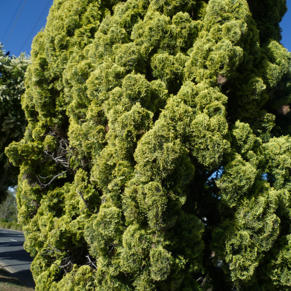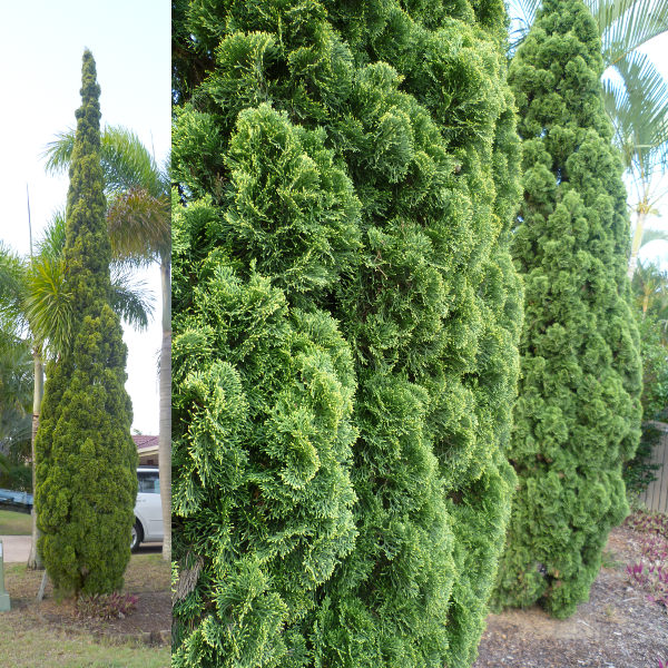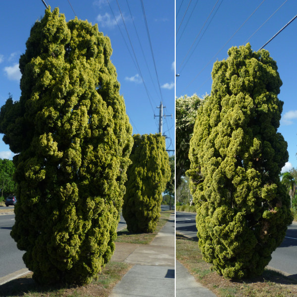 This section is intended for nurseries which might be considered conifer specialists, for customers seeking a greater selection or rare varieties. If you operate such a nursery, click here: Advertising information. Using ConifersConifers don't produce flowers, but more primitive cones. Many are commonly referred to as "Pines", even if they don't belong to the genus Pinus. There are species that grow in tropical regions, and others in very cold parts of the world. Many of the popular ornamental conifers for gardens come from the Northern Hemisphere. Queenslanders, especially residents of the subtropical and tropical zones, should make sure the varieties they select are suitable for their climate and give them appropriate care. This is especially important if the plants are to be used in formal applications, such as hedges, avenue or framing an entranceway because the effect will be spoiled if the plants grow unevenly. When specimens of uniform texture and growth rate will be required, look for vegetatively propagated (cuttings or grafted) stock of named cutivars from reputable suppliers. Even in the case of single feature plants, named (vegetatively propagated) cultivars selected for superior form and foliage characteristics will be preferable to less predictable plants from seed, Propensity to produce cones may be another characteristic to look for when selecting a cultivar. If the conifer is being grown for its foliage (e.g. pencil pines), cones can be unattractive and divert energy from vegetative growth. The Bunya Pine and the Wollemi Pine are two Australian native conifers appreciated for their ornamental qualities, but are far too large for ordinary garden cultivation (although the Wollemi pine is being promoted as a pot plant). In the future, perhaps other native conifers will be developed for ornamental use. The so-called "Daintree Pine" is actually a member of the Casuarina family. Gymnostoma australianum, from the Daintree rainforest of North Queensland, has a coniferous appearance and could be subsituted for conifers where a Mediterranean look or a home-grown Christmas tree is wanted in a tropical climate. (for more information on Gymnostoma, go to the Casuarina page. PruningTake care with pruning, as conifers are unlikely to reshoot from old wood. A lillypilly or murraya hedge might be cut back hard and be the better for it. A conifer hedge, however, will need regular attention to develop bushiness, then to maintain size and shape when mature. Images and notes on some conifers in QueenslandThis collection will be added to over time, to help readers see what various types look like and how they perform in real life. The Pencil Pine - Cupressus sempervirensThis popular conifer has been given its own page here: Pencil Pines Bookleaf Pine - Platycladus orientalisOther names: Chinese arborvitae, Thuja orientalis. They are seen in many older gardens around Brisbane and are easily recognised by the vertical fans of foliage arranged like pages of a book. This is one of the most successful non-native garden conifers in the subtropics. However, they take up a lot of space and a lot of the older ones have ended up being hacked back eventually. Plant where there is enough room for them to develop their natural dome shape, which is their main feature.