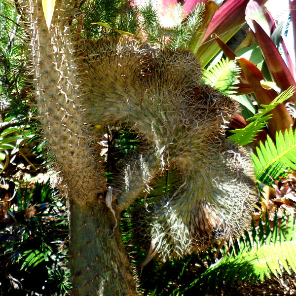Pachypodium species are members of the same family, and are often discussed in conjunction with the adeniums as they have a somewhat similar growth habit. One of the most obvious differences is the presence of distinctive spines on the trunk.
