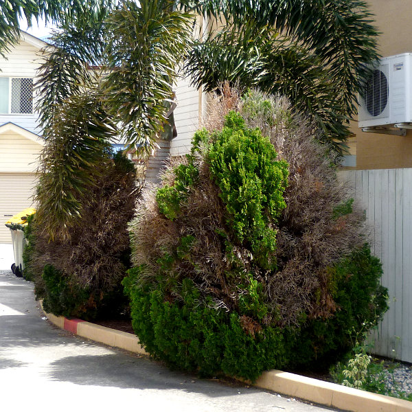 This section is intended for nurseries which might be considered conifer specialists, for customers seeking a greater selection or rare varieties. If you operate such a nursery, click here: Advertising information. Using ConifersConifers don't produce flowers, but more primitive cones. Many are commonly referred to as "Pines", even if they don't belong to the genus Pinus. There are species that grow in tropical regions, and others in very cold parts of the world. Many of the popular ornamental conifers for gardens come from the Northern Hemisphere. Queenslanders, especially residents of the subtropical and tropical zones, should make sure the varieties they select are suitable for their climate and give them appropriate care. This is especially important if the plants are to be used in formal applications, such as hedges, avenue or framing an entranceway because the effect will be spoiled if the plants grow unevenly. When specimens of uniform texture and growth rate will be required, look for vegetatively propagated (cuttings or grafted) stock of named cutivars from reputable suppliers. Even in the case of single feature plants, named (vegetatively propagated) cultivars selected for superior form and foliage characteristics will be preferable to less predictable plants from seed, Propensity to produce cones may be another characteristic to look for when selecting a cultivar. If the conifer is being grown for its foliage (e.g. pencil pines), cones can be unattractive and divert energy from vegetative growth. The Bunya Pine and the Wollemi Pine are two Australian native conifers appreciated for their ornamental qualities, but are far too large for ordinary garden cultivation (although the Wollemi pine is being promoted as a pot plant). In the future, perhaps other native conifers will be developed for ornamental use. The so-called "Daintree Pine" is actually a member of the Casuarina family. Gymnostoma australianum, from the Daintree rainforest of North Queensland, has a coniferous appearance and could be subsituted for conifers where a Mediterranean look or a home-grown Christmas tree is wanted in a tropical climate. (for more information on Gymnostoma, go to the Casuarina page. PruningTake care with pruning, as conifers are unlikely to reshoot from old wood. A lillypilly or murraya hedge might be cut back hard and be the better for it. A conifer hedge, however, will need regular attention to develop bushiness, then to maintain size and shape when mature. Images and notes on some conifers in QueenslandThis collection will be added to over time, to help readers see what various types look like and how they perform in real life. The Pencil Pine - Cupressus sempervirensThis popular conifer has been given its own page here: Pencil Pines Bookleaf Pine - Platycladus orientalisOther names: Chinese arborvitae, Thuja orientalis. They are seen in many older gardens around Brisbane and are easily recognised by the vertical fans of foliage arranged like pages of a book. This is one of the most successful non-native garden conifers in the subtropics. However, they take up a lot of space and a lot of the older ones have ended up being hacked back eventually. Plant where there is enough room for them to develop their natural dome shape, which is their main feature.